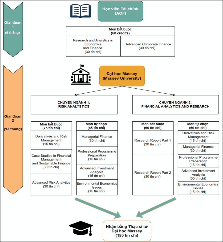 - Giai đoạn II (12 tháng) tại Massey University – New Zealand: Học viên tiếp tục học các môn chuyên sâu và làm luận văn. Chương trình có hai hướng chuyên môn: